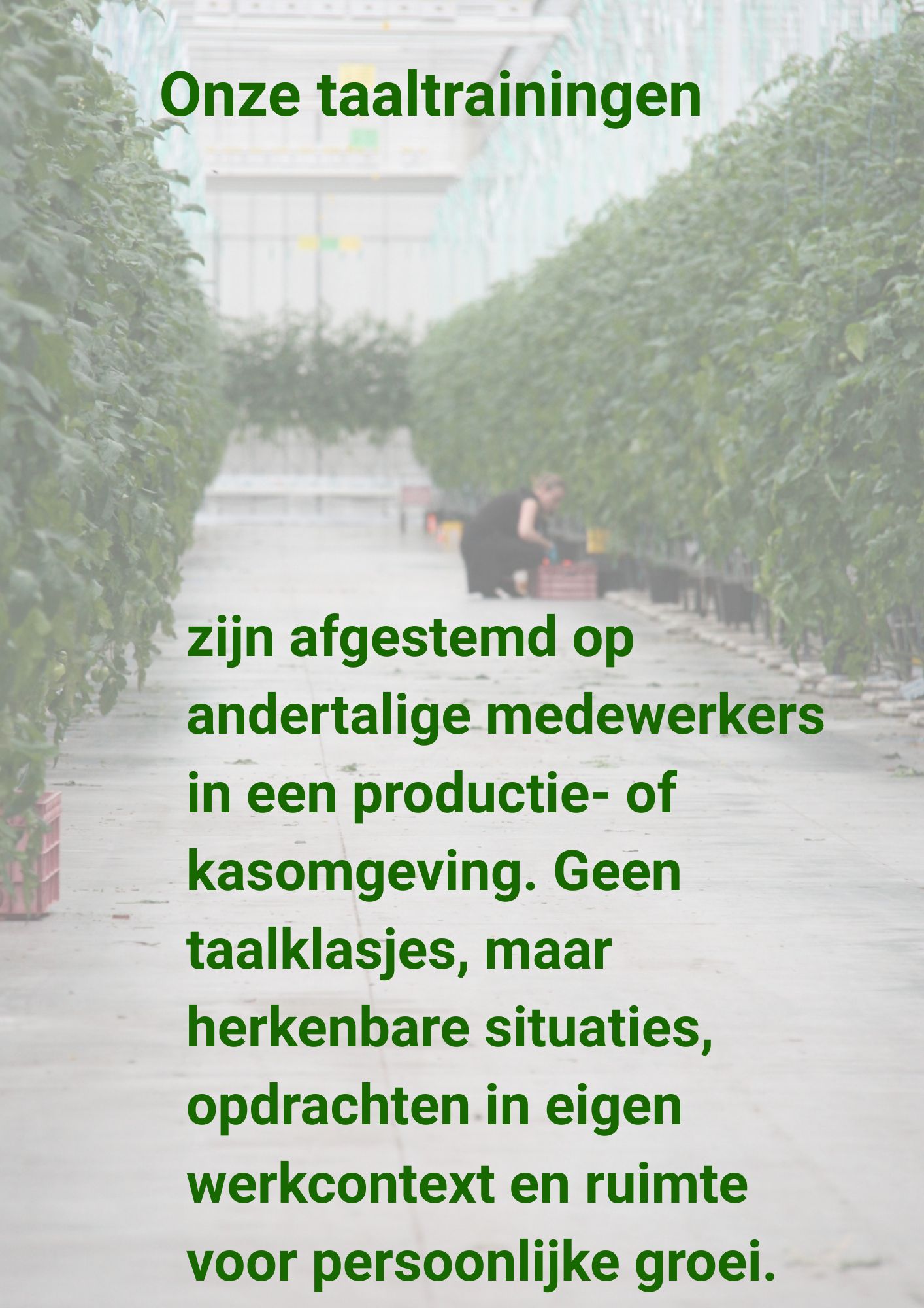 Naast onze BBL-opleidingen biedt Greenskills een breed aanbod aan trainingen en cursussen. Gericht op de praktijk van de glastuinbouw- logistiek- en AGF-sector versterken we de taalvaardigheid, vakkennis, veiligheid én wettelijke certificering van medewerkers. Onze aanpak is altijd praktisch en op maat, zodat leren direct iets oplevert op de werkvloer.